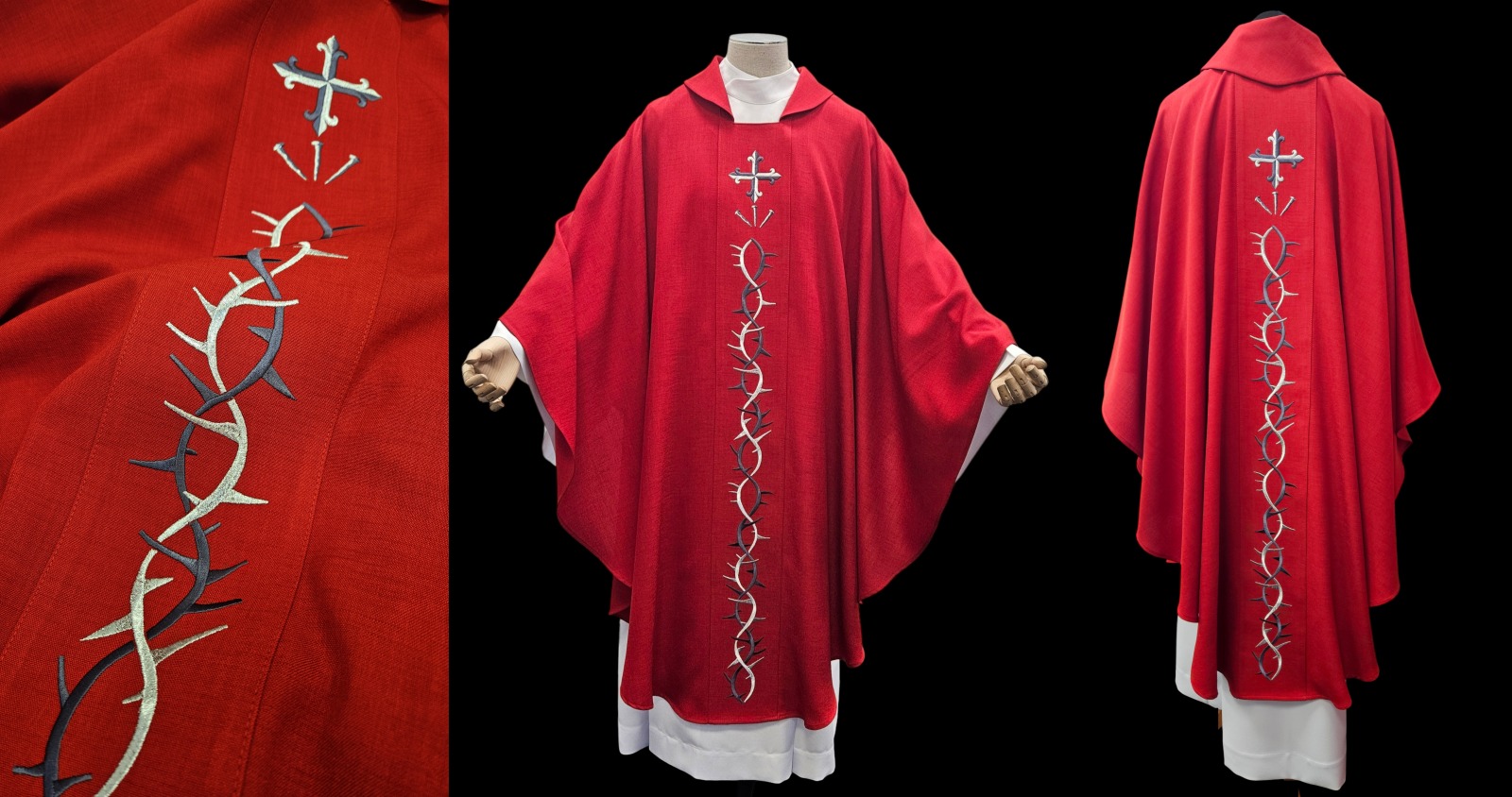 zobacz produkt... Ekskluzywny ornat wełniany ze złota pasmanterią i haftowanym krzyżem na aksamicie oraz ozdobną stułą