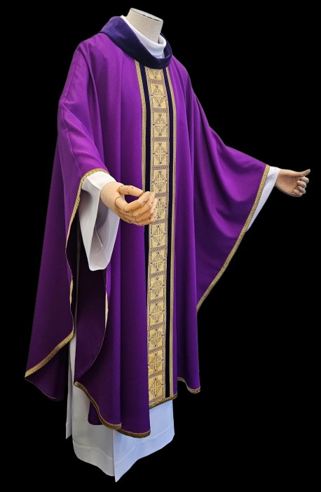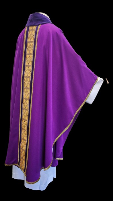 Elegancki ornat uszyty z lekkiej tkaniny, ozdobiony misternym złotym galonem orz aksamitnym kołnierzem. Doskonały dla duchownych podczas ceremonii i nabożeństw. Prosty i lekki ornat, praktyczny w użytkowaniu ze stułą wewnętrzną w komplecie.