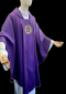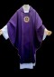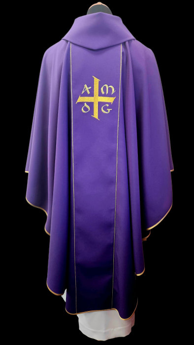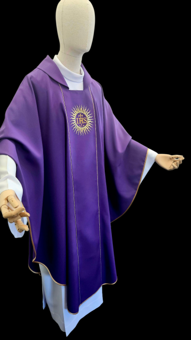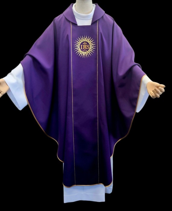 Haftowany ornament z subtelną elegancją zdobi szatę liturgiczną o lekkiej tkaninie. Złota lamówka z atłasowym wykończeniem dodaje wyjątkowego blasku. Na pasie wyhaftowane złote symbole zakonu Jezuitów.
