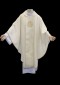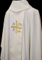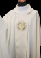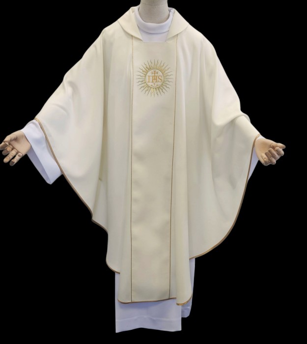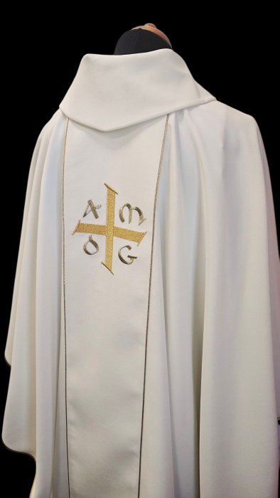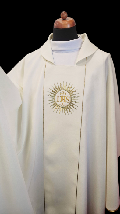 Haftowany ornament z subtelną elegancją zdobi szatę liturgiczną o lekkiej tkaninie. Złota lamówka z atłasowym wykończeniem dodaje wyjątkowego blasku. Na pasie wyhaftowane złote symbole zakonu Jezuitów.
