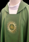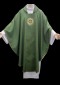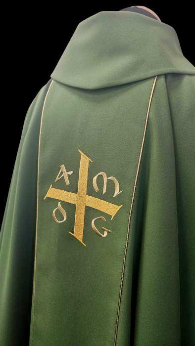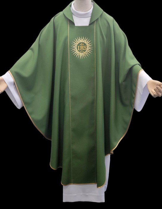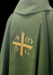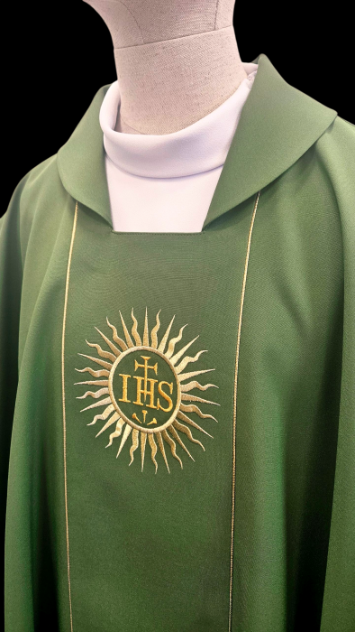 Haftowany ornament z subtelną elegancją zdobi szatę liturgiczną o lekkiej tkaninie. Złota lamówka z atłasowym wykończeniem dodaje wyjątkowego blasku. Na pasie wyhaftowane złote symbole zakonu Jezuitów.