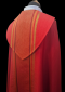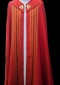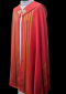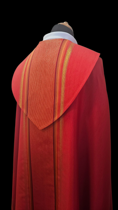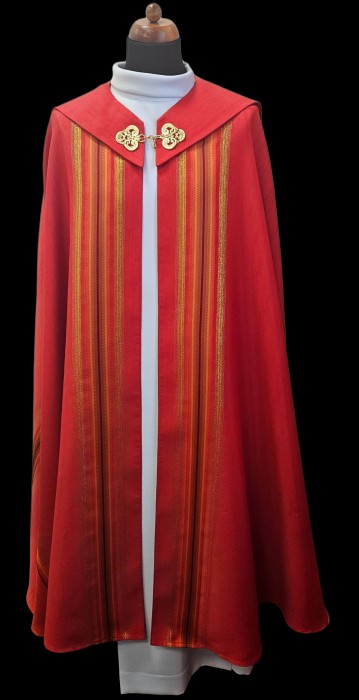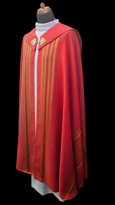 Kapa czerwona wykonana z lekkiej cieniowanej tkaniny w odcieniach złota i czerwieni. Cieniowane pasy zdobią także boki i kaptur. Zapięcie z kutą złotą klamrą. Lekka i prosta w formie kapa z podszewką i stułą wewnętrzną w komplecie.