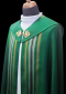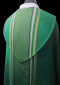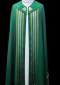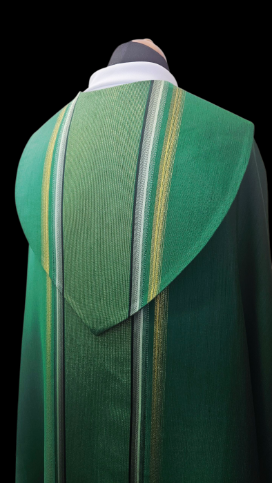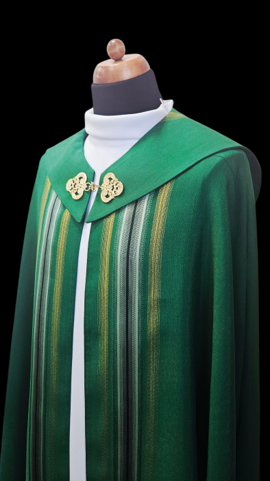 Kapa kapłańska zielona wykonana z lekkiej cieniowanej tkaniny w odcieniach złota i zieleni. Cieniowane pasy zdobią także boki i kaptur. Zapięcie z kutą złotą klamrą. Lekka i prosta w formie kapa z podszewką i stułą wewnętrzną w komplecie.
