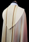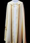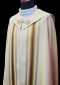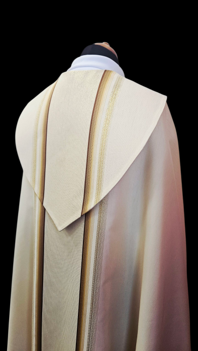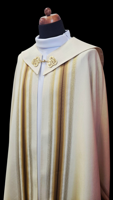 Kapa kapłańska kremowa wykonana z lekkiej cieniowanej tkaniny w odcieniach złota i beżu. Cieniowane pasy zdobią także boki i kaptur. Zapięcie z kutą złotą klamrą. Lekka i prosta w formie kapa z podszewką i stułą wewnętrzną w komplecie.