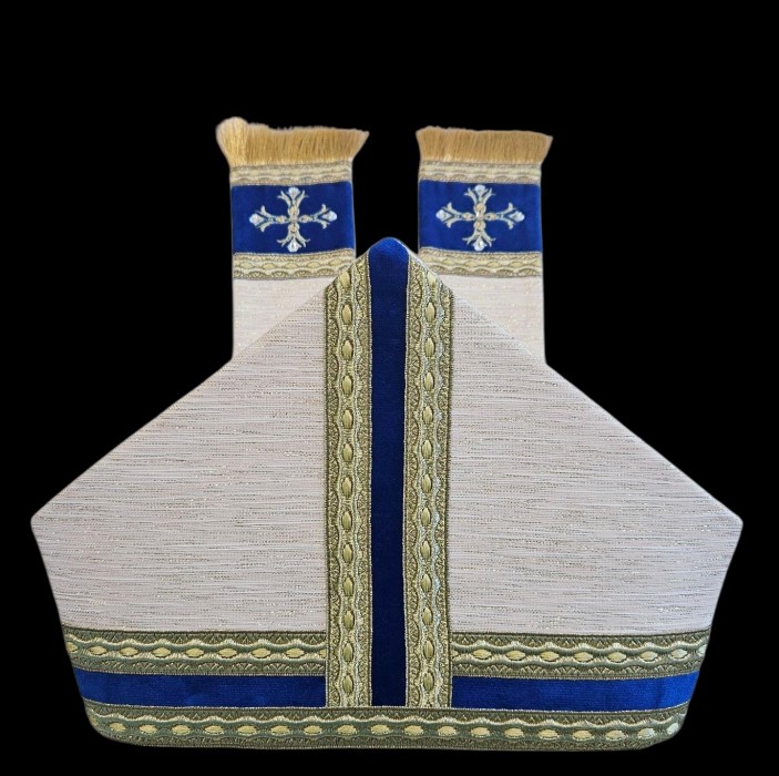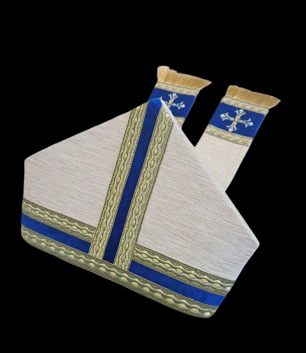 Krój: Mitra biskupia, inaczej infuła, to wysokie, ozdobne nakrycie głowy, będące oznaką godności biskupiej i noszone przez biskupów podczas celebracji liturgicznych.