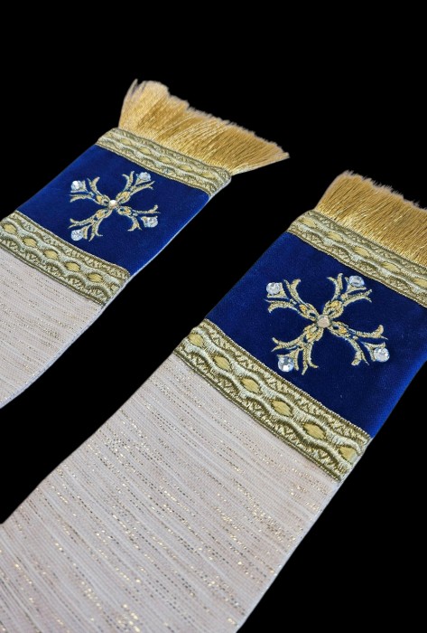 Mitra ozdobiona naszywanymi złotymi taśmami, aksamitem i haftem.
