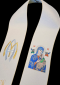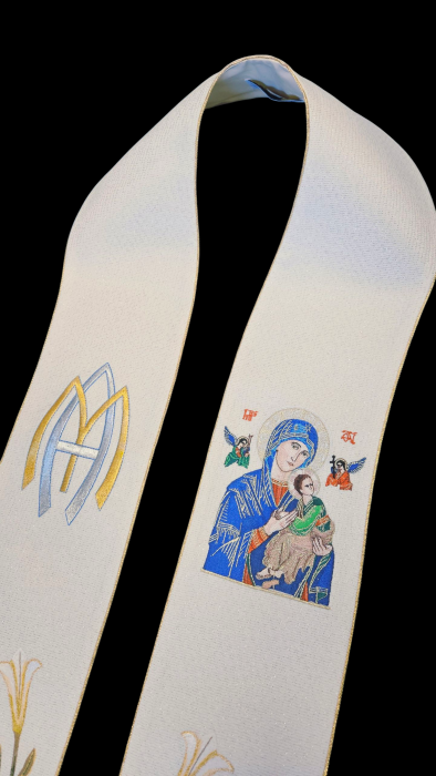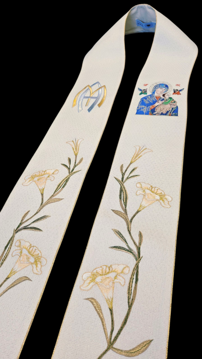 Elegancka stuła liturgiczna Maryjna, wykonana z szlachetnej tkaniny kremowej z wplecioną nitką srebrną. Z haftem Matki Bożej Nieustającej Pomocy, emblematem M oraz lilią. Doskonała dla duchownych.
