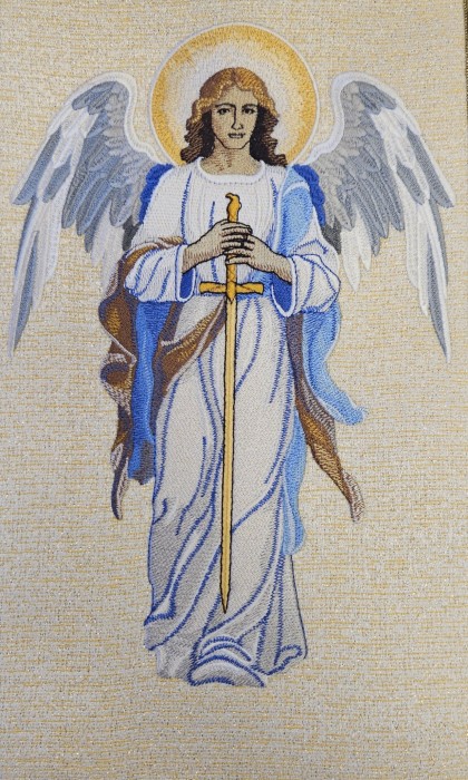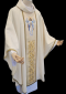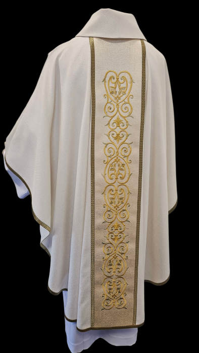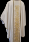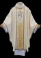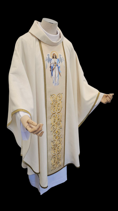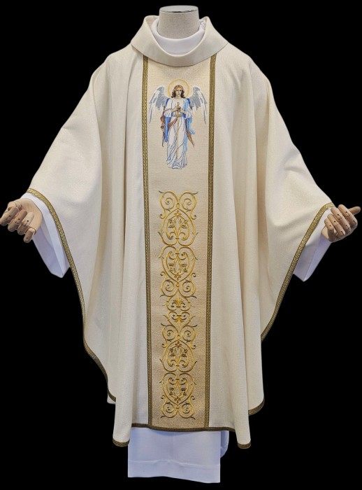 Ornat kapłański haftowany ozdobiony haftowanym wizerunkiem Michała Archanioła. Całość ozdobiona bogatym haftem na pasie złotym. Szata liturgiczna uszyta z tkaniny kremowej z nicią złotą ozdobnej i wykończona złotą szlachetną pasmanterią. Do kompletu stuła haftowana. Tył ornatu również bogato zdobiony złotym ornamentem. Idealna szata na uroczyste ceremonie liturgiczne, emanująca wyjątkowym stylem i elegancją.