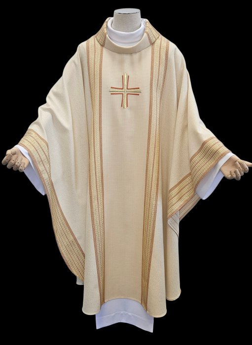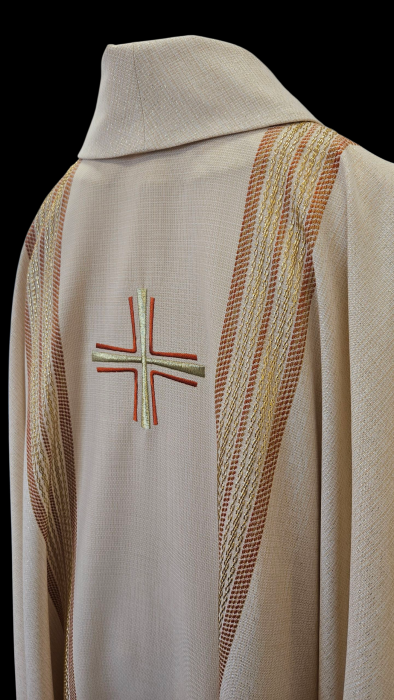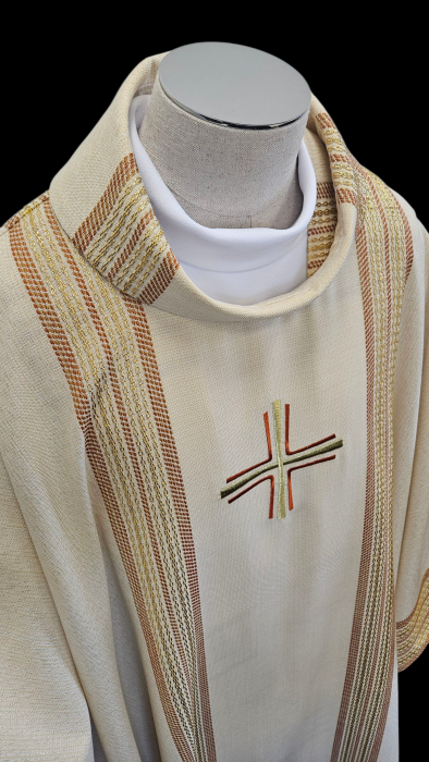 Ekskluzywny ornat ręcznie tkany z najwyższej jakości wełny to doskonała kombinacja elegancji, staranności wykonania i wykończenia. Doskonały wybór dla uroczystych okazji. Tkanina tkana z nici wełnianych o różnej grubości i fakturze splotu, dodatkowo z wplecioną nicią złotą z lureksu. Pośrodku haftowany krzyż. To elegancka szata liturgiczna z wyrazistymi, cieniowanymi pasami pośrodku i po bokach stworzona z najwyższej jakości materiałów całkowicie wełnianych. Idealna dla uroczystych ceremonii i liturgii.