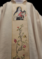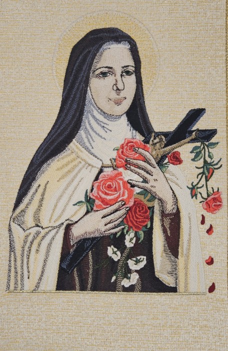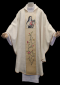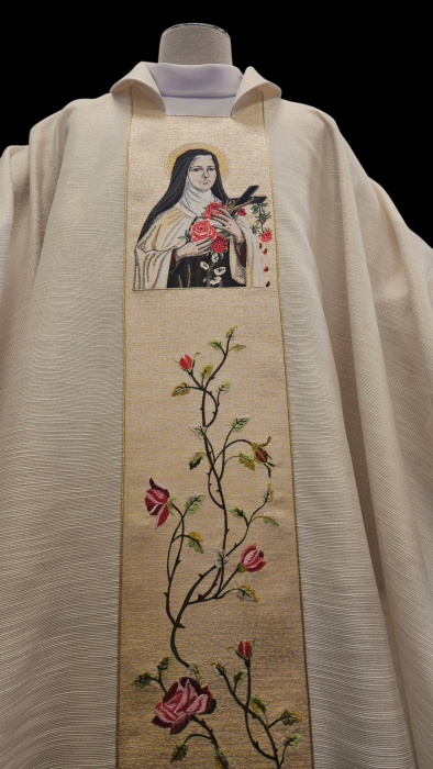 Ornat kapłański ozdobiony haftowanym wizerunkiem Św. Teresy. Całość ozdobiona bogatym kwiatowym haftem na pasie złotym. Szata liturgiczna uszyta z tkaniny kremowej z nicią złotą ozdobnej i wykończona złotą szlachetną pasmanterią. Do kompletu stuła haftowana. Tył ornatu również bogato zdobiony złotym wypukłym IHS i kwiatowym ornamentem. Idealna szata na uroczyste ceremonie liturgiczne, emanująca wyjątkowym stylem i elegancją.