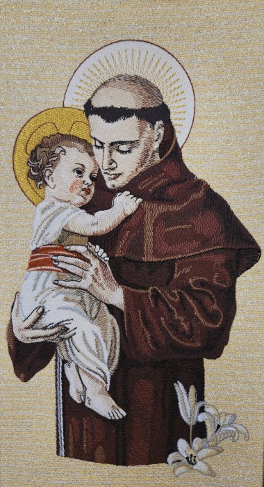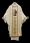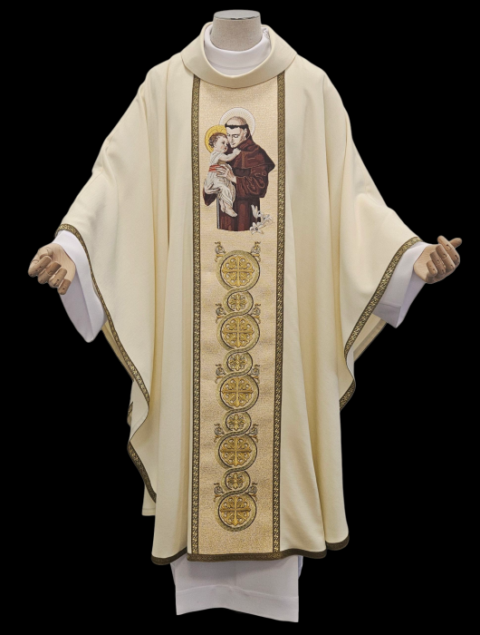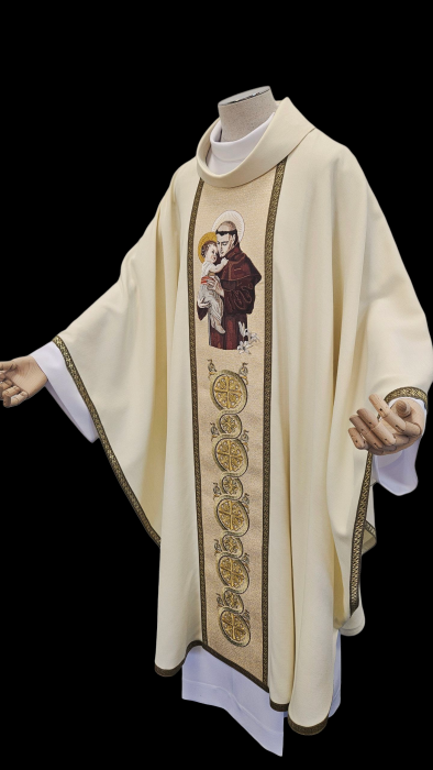 Ornat kapłański haftowany ozdobiony haftowanym wizerunkiem Św. Antoniego. Całość ozdobiona bogatym haftem na pasie złotym. Szata liturgiczna uszyta z tkaniny kremowej i wykończona złotą szlachetną pasmanterią. Do kompletu stuła haftowana. Tył ornatu również bogato zdobiony złotym ornamentem. Idealna szata na uroczyste ceremonie liturgiczne, emanująca wyjątkowym stylem i elegancją.