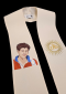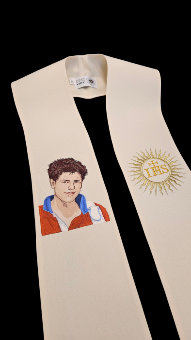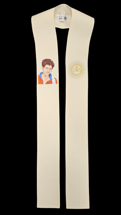 Elegancka stuła kapłańska w kolorze kremowym z mistycznym haftem Świętego Karola Acutisa i złotym symbolem IHS. Idealna dla uroczystych celebracji.