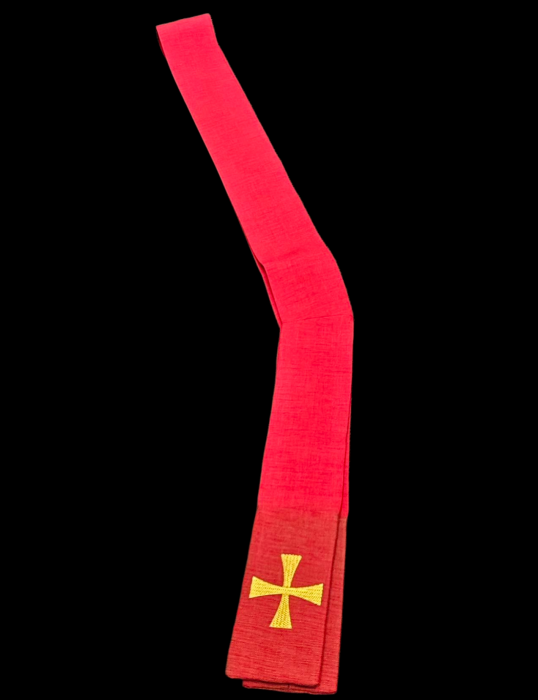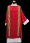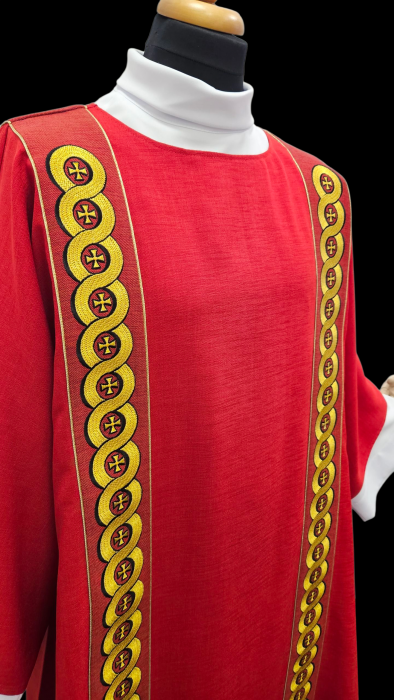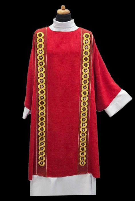 Dalmatyka diakońska uszyta z lekkiej i praktycznej w użytkowaniu tkaniny. Bogaty haft wykonany na szlachetnej wełnianej tkaninie i wykończony złotą wypustką. Do kompletu stuła wewnętrzna diakońska w stylistyce ornatu. Dalmatyka dostępna we wszystkich kolorach liturgicznych. Idealne dopasowanie do ornatów o numerach: 2-701, 2-701 B, 2-704