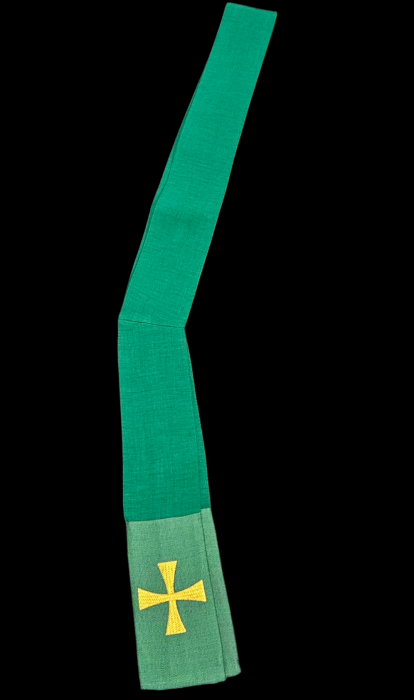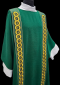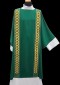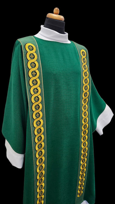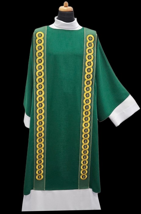 Dalmatyka diakońska uszyta z lekkiej i praktycznej w użytkowaniu tkaniny. Bogaty haft wykonany na szlachetnej wełnianej tkaninie i wykończony złotą wypustką. Do kompletu stuła wewnętrzna diakońska w stylistyce ornatu. Dalmatyka dostępna we wszystkich kolorach liturgicznych. Idealne dopasowanie do ornatów o numerach: 2-701, 2-701 B, 2-704