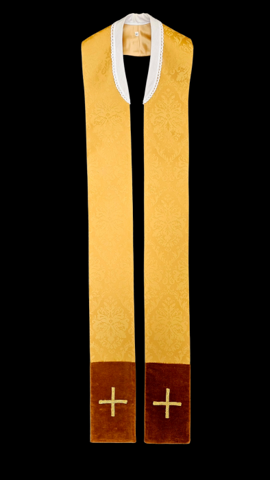 Wyjątkowy ornat wykonany z lekkiej tkaniny typu adamaszek o zaznaczonej strukturze wzoru i połysku. Szata ozdobiona złotym barwnym haftem Eucharystycznym na aksamitnym, miodowym pasie. Centralny element to haftowany na złoto symbol IHS. Kołnierz również aksamitny. W komplecie stuła z stylistyce nawiązującej do ornatu. Szlachetna atłasowa lamówka, złote wypustki nadają szacie wyjątkowy charakter.