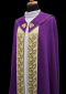 Elegancka kapa kapłańska ze stułą wewnętrzną i kutą klamrą. Szata ozdobiona bogatym geometrycznym haftem w kolorach złota z zaznaczonymi cieniami w kolorze czerni. Bogaty haft został wykonany na złotym pasie i wykończony elegancką złotą pasmanterią. Piękno i szlachetność szaty podkreśla również haftowany złoty pas na kapturze kapy. Lekka tkanina, bogaty haft na pasie, złota pasmanteria – doskonałe połączenie stylu i klasy.