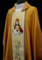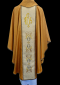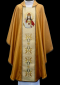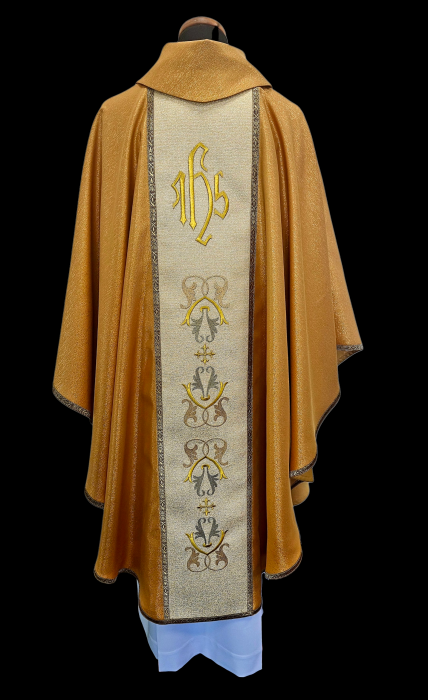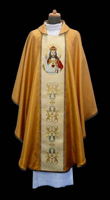 Elegancki ornat haftowany w stylu monastycznym, uwieczniający Chrystusa Króla. Ornat uszyty z lekkiej tkaniny złotej.Precyzyjne zdobienia i bogaty haft na brokatowym pasie - unikalna i duchowa ozdoba liturgiczna. Wizerunek Pana Jezusa precyzyjnie haftowany na ozdobnym brokatowym pasie i dodatkowo ozdobiony bogatym złotym ornamentem, tył również zdobiony wzorem złotym. Do komplety stuła wewnętrzna.