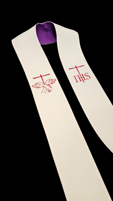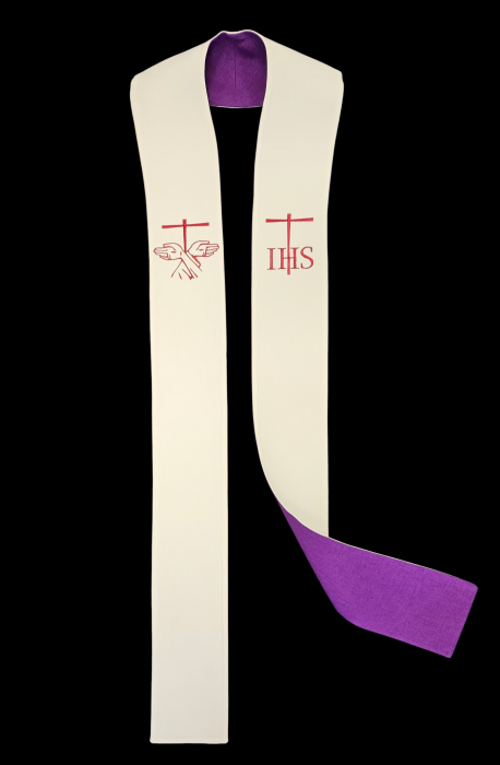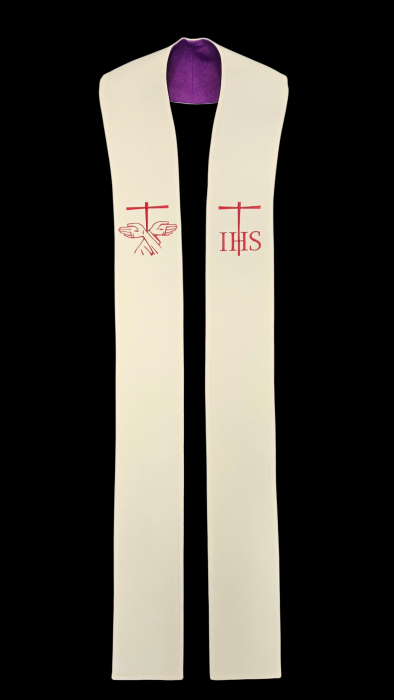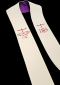 Stuła Franciszkańska z motywem haftowanych skrzyżowanych rąk Pana Jezusa i św. Franciszka, łączą prostotę, duchowość i symbolikę stygmatów. Stuła dwustronna kremowo fioletowa