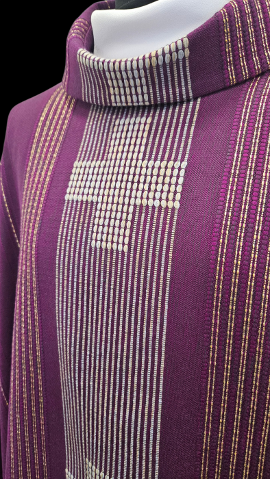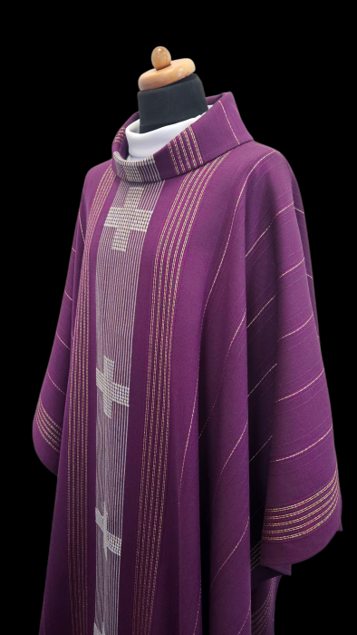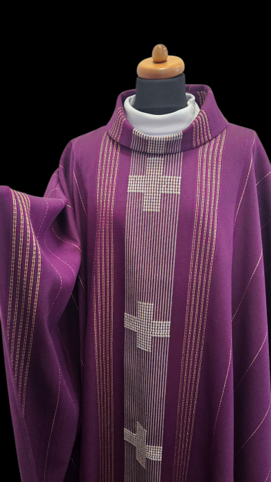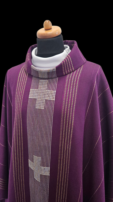 Ornat uszyty z najwyższej jakości wełnianej tkaniny z ręcznie tkanymi motywami krzyża.