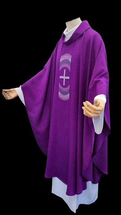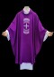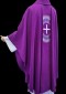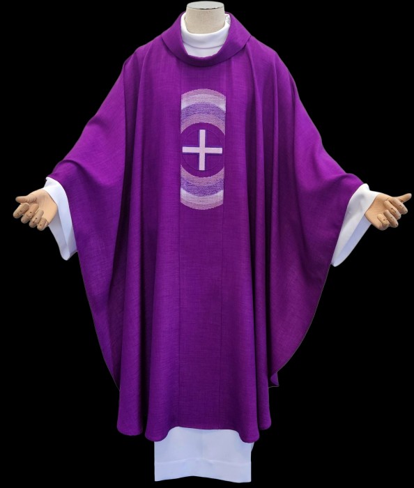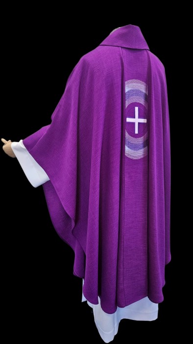 Elegancki ornat z lekkiej tkaniny ozdobiony nowoczesnym haftem na pasie. Wyjątkowy wzór, przepiękny cieniowany haft krzyża. Idealny na mszę. Do kompletu stuła wewnętrzna z haftowanymi krzyżykami.