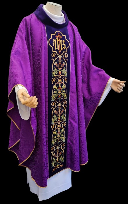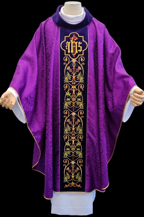 Wyjątkowy ornat wykonany z adamaszku,tkaniny o wyraźnej fakturze wzoru i połysku. Szata ozdobiona złotym barwnym haftem Eucharystycznym na aksamitnym pasie.Centralny element to haftowany na złoto symbol IHS . Kołnierz również aksamitny. W komplecie stuła z stylistyce nawiązującej do ornatu. Szlachetna atłasowa lamówka, złote wypustki nadają szacie wyjątkowy charakter.