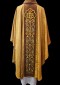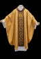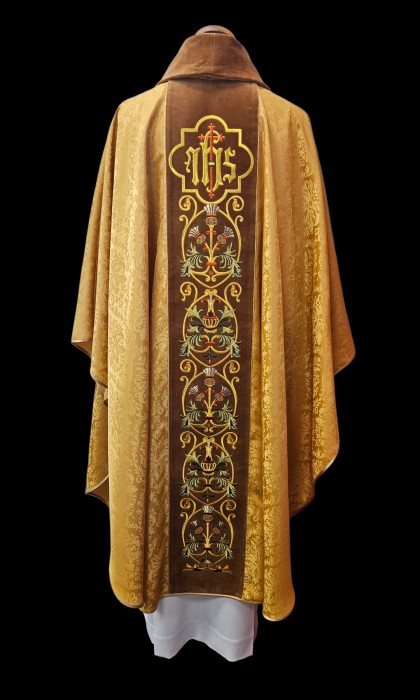 Wyjątkowy ornat wykonany z lekkiej tkaniny typu adamaszek o zaznaczonej strukturze wzoru i połysku. Szata ozdobiona złotym barwnym haftem Eucharystycznym na aksamitnym, miodowym pasie. Centralny element to haftowany na złoto symbol IHS. Kołnierz również aksamitny. W komplecie stuła z stylistyce nawiązującej do ornatu. Szlachetna atłasowa lamówka, złote wypustki nadają szacie wyjątkowy charakter.