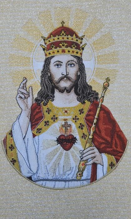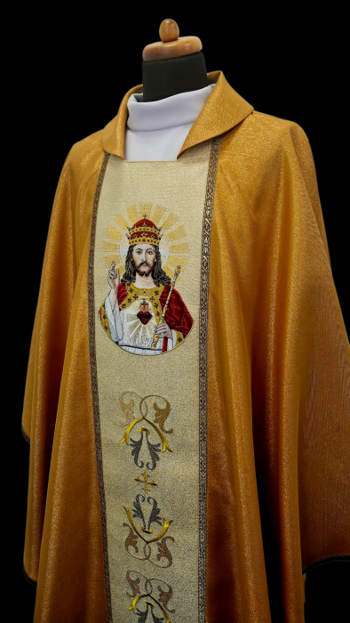 Elegancki ornat haftowany w stylu monastycznym, uwieczniający Chrystusa Króla. Ornat uszyty z lekkiej tkaniny złotej.Precyzyjne zdobienia i bogaty haft na brokatowym pasie - unikalna i duchowa ozdoba liturgiczna. Wizerunek Pana Jezusa precyzyjnie haftowany na ozdobnym brokatowym pasie i dodatkowo ozdobiony bogatym złotym ornamentem, tył również zdobiony wzorem złotym. Do komplety stuła wewnętrzna.